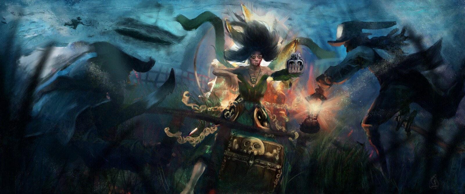 A full illustration made about a guardian queen of the seas where all pirates want to take over the chest she guards